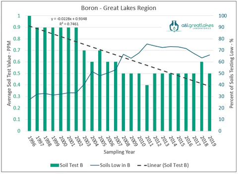 Sulfur deficiencies in soil samples began rising sharply after 2008, coinciding with the implementation of emission-reduction mandates. Boron has shown a similar trend. By 2019, over 95% of soils tested below 0.08 ppm boron—a level that research has consistently associated with lost yield potential in both corn and soybeans. These findings confirm that elements once supplied naturally must now be intentionally supplemented through nutrient programs to maintain crop balance, efficiency, and yield.