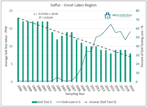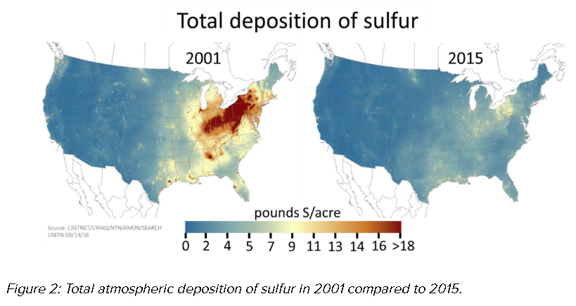 According to long-term soil test data from A&L Laboratories, this change has had a measurable agronomic impact. In 2001, many areas of the Midwest received approximately 12 pounds of sulfur per acre per year from atmospheric deposition. Today, that number has fallen to less than half a pound.